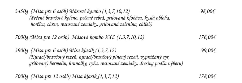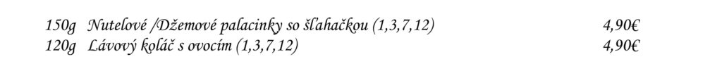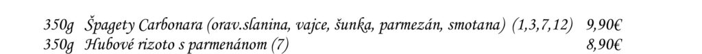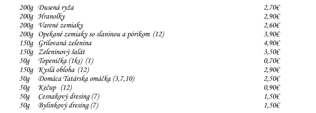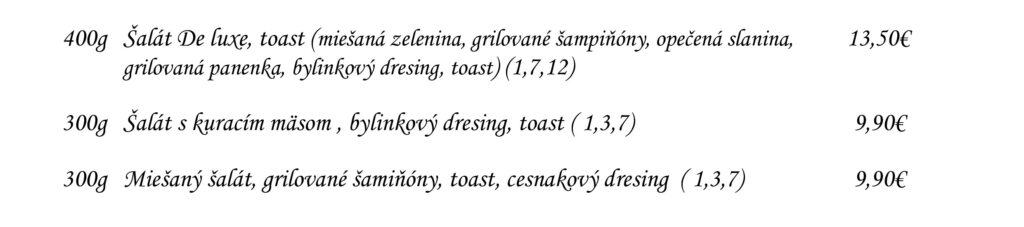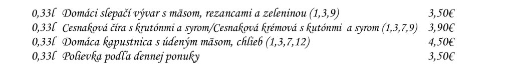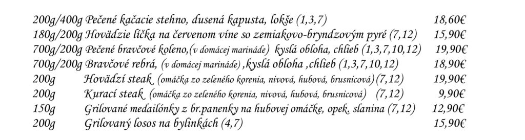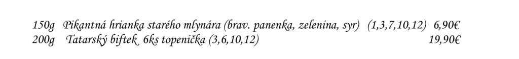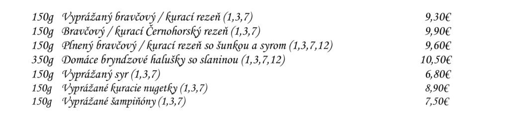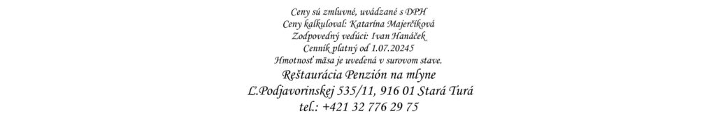 Predjedlá Polievky Klasické jedlá Špeciality Šaláty Špeciality Mlyna Cestoviny Prílohy Dezerty Pochutiny Reštaurácia Penzión na mlyne Ľ.Podjavorinskej 535/11, 916 01 Stará Turátel.: +421 32 776 29 75