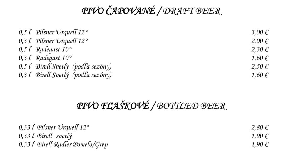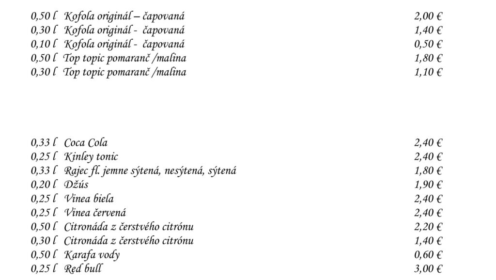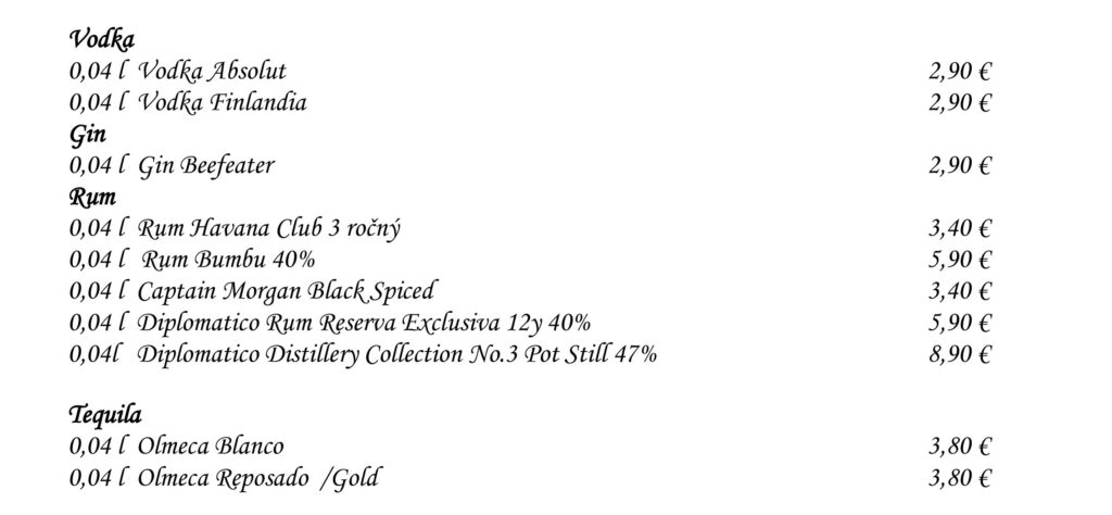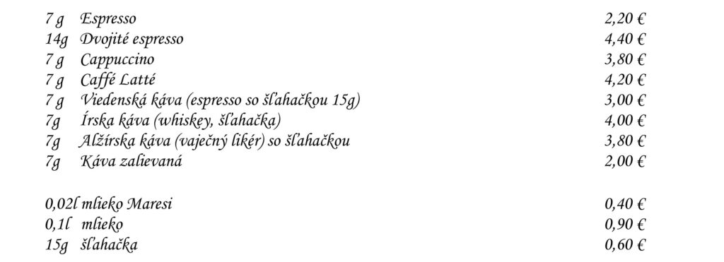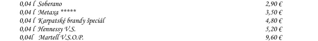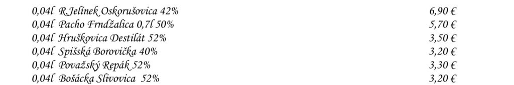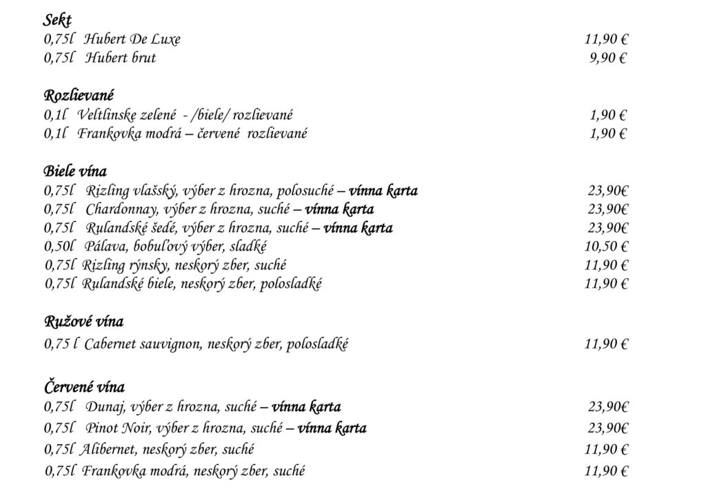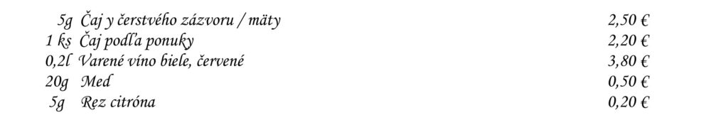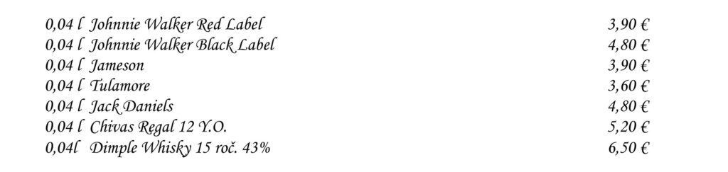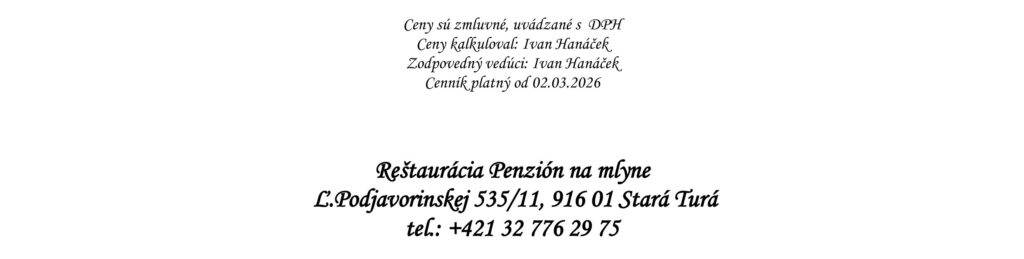 Aperitívy Destiláty Whiskey & Bourbon Gognac & Brandy Destiláty Likéry Víno Chateau Topoľčianky Pivo Nealkoholické nápoje Káva Teplé nápoje Reštaurácia Penzión na mlyne Ľ.Podjavorinskej 535/11, 916 01 Stará Turátel.: +421 32 776 29 75