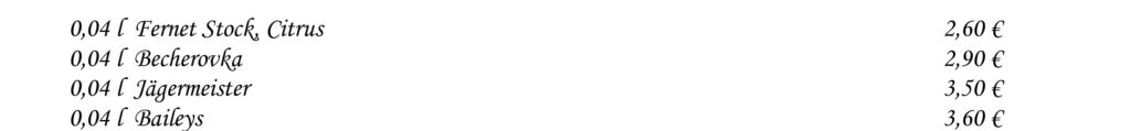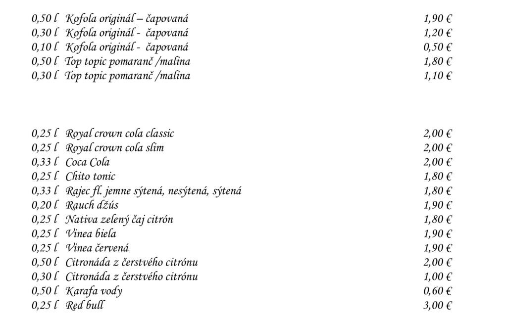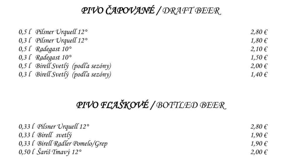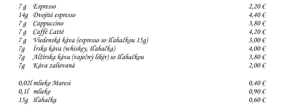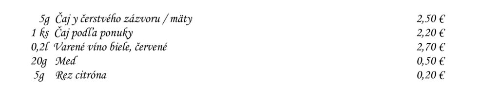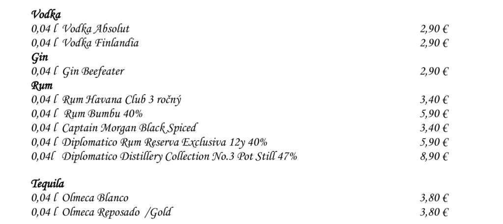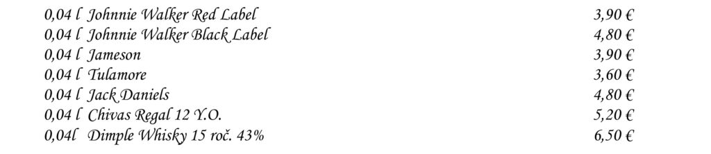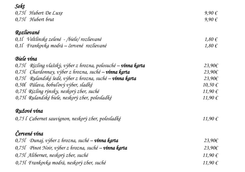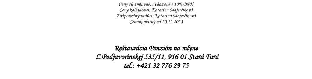 Aperitívy Destiláty Whiskey & Bourbon Gognac & Brandy Destiláty Likéry Víno Chateau Topoľčianky Pivo Nealkoholické nápoje Káva Teplé nápoje Reštaurácia Penzión na mlyne Ľ.Podjavorinskej 535/11, 916 01 Stará Turátel.: +421 32 776 29 75